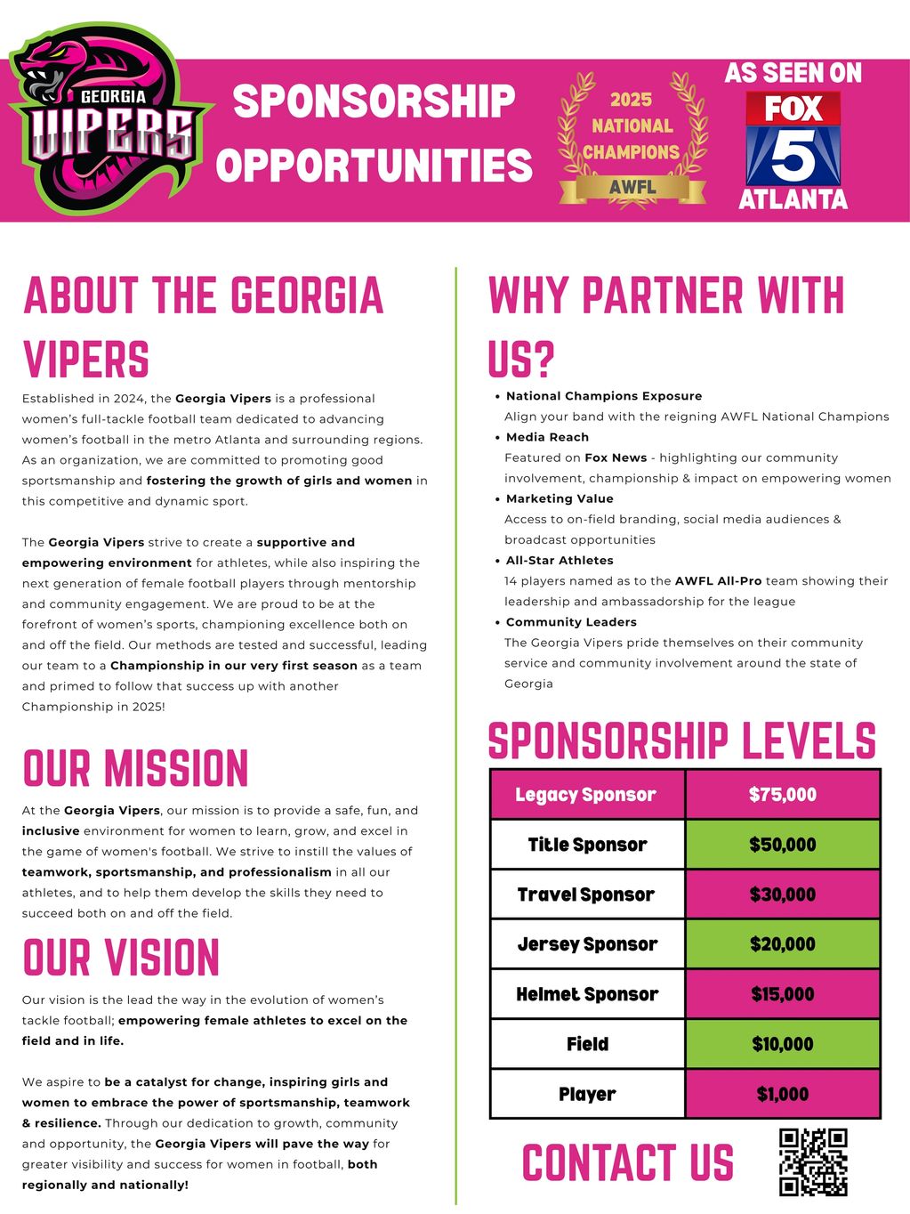 The Georgia Vipers aren’t just a football team—we’re a force redefining what’s possible in women’s sports. As a full-contact women’s tackle football team, we bring intensity, athleticism, and heart to every down. Our players train like pros, hit like pros, and inspire like champions—on and off the field.